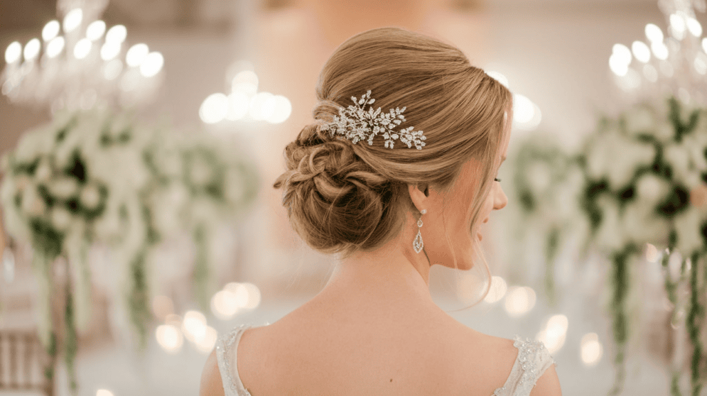 Precious metals like gold, silver, and platinum are popular choices. They can be mixed with crystals, pearls, or other decorations for a unique look. For instance, a gold hair comb with crystals adds glamour to your updo. A silver headband with pearls offers a more elegant yet subtle look.